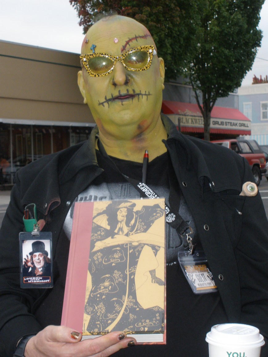Last night, I heard of Wilum Hopfrog Pugmire’s death from friend and editor Bret Kramer. This morning, my Facebook news feed contains numerous images and remembrances of this singular individual. So, I throw one more picture of ye Queen of Eldritch Horror into the void in the vain hopes that it should finally be full. I took it of Wilum holding a copy of the author’s sumptuous Centipede Press collection, THE TANGLED MUSE, in 2010.